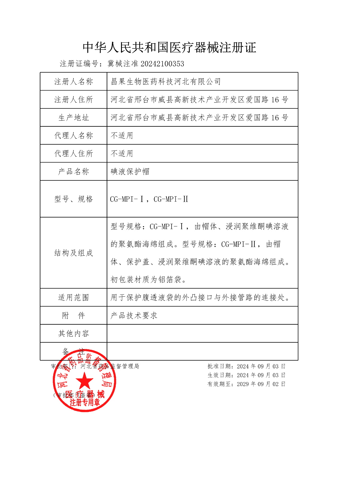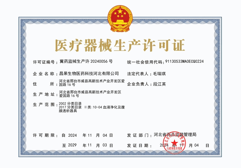 2024年9月,昌果生物医药科技河北有限公司顺利取得医疗器械产品注册证。